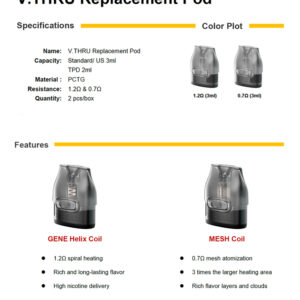 The V.THRU Pro comes with a 3ml refillable pod, featuring a convenient side-fill design and a 0.7ohm mesh coil or 1.2ohm coil for optimal flavor and vapor production. Additionally, the V.THRU Pro utilizes an innovative adjustable airflow system, allowing you to customize your vaping experience to your exact preferences.